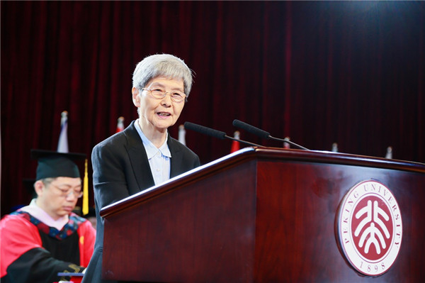 视频结束后,毕业典礼正式开始。“我们今天东风桃李,用青春完成作业;我们明天巨木成林,让中华震惊世界。”一曲《燕园情》,写出了北大学子不同时期的际遇和梦想。2016、2017级在校生代表的领唱下,全场共同唱起了这首北大人心中永恒的旋律。