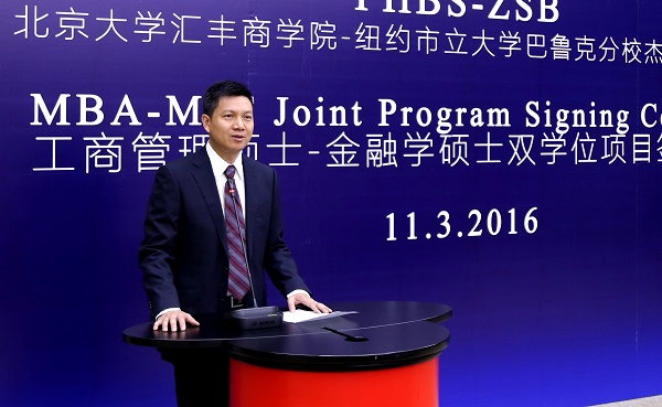 2016年11月3日上午,汇丰商学院与纽约市立大学巴鲁克分校杰克林商学院在深圳举行签约仪式,双方联手打造工商管理硕士(MBA)-金融学硕士(MSF)双学位项目。出席签约仪式的嘉宾包括北京大学校务委员会副主任、汇丰商学院院长海闻,纽约市立大学巴鲁克分校校长Mitchel Wallerstein、纽约市立大学巴鲁克分校副校长Myung-Soo Lee,杰克林商学院院长Fenwick Huss,杰克林商学院副院长胡清,汇丰商学院副院长任颋、李志义,汇丰商学院院长助理、MBA项目主任岑维,MBA项目办公室主任毛娜,国际事务办公室主任Nicole,公关媒体办公室主任本力。签约仪式由岑维教授主持。