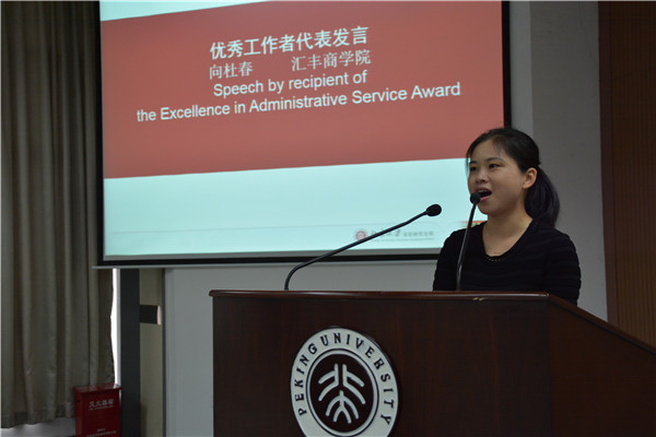 来自汇丰商学院全日制研究生培养办公室的向杜春作为优秀工作者代表发言,她首先表示非常荣幸能够得到优秀工作者的荣誉,随后她总结了自己所做的工作,并说出了自己对行政工作的理解:“行政老师可能无法为大家提供专业方面的知识,只能用自己有限的经验,帮助同学们少走弯路。”