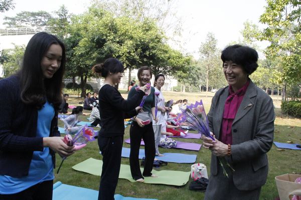 3月8日上午,为庆祝妇女节而开展的“丽人节户外瑜伽活动”在D阶草坪拉开序幕。参与活动的既有北大深研院各个学院的同学,也有从事行政、教学工作的多位老师。深圳研究生院常务副院长史守旭,副院长牛宏伟,院党委副书记、学工处处长安晓朋等领导、老师参加本次活动,并把鲜花与礼物赠送给在场的老师与同学。
