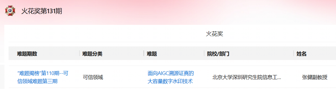 难题牵引,技术破局——张健长聘副教授针对第110期难题揭榜-可信领域第三期-难题5:面向AIGC溯源证真的大容量数字水印技术,提出一套自主研发的水印技术方案,融合了高压缩率信息编码与大容量可逆隐写技术,有效提升了信息嵌入的密度与隐蔽性,各项性能均满足全部技术指标要求。