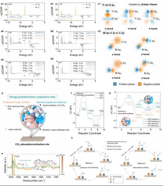 氧空位(Ovac)与拉伸应变的协同作用促进了Ti 3d轨道中自旋极化电子的占据,使CO2以侧向(side-on)构型吸附在Bi–Ovac–Ti位点上,促进C–O键断裂。更为重要的是,尽管拉伸应变削弱了Bi–C轨道杂化,但使Bi原子能够捕获来自氧的孤对电子,从而在CO2→ CO转化过程中极化C–O键。较弱的Bi–C重叠降低了Bi原子处的电荷密度,而Ti原子则通过增强电子供给进行补偿,从而促进双向电荷转移与C–O键断裂。这种“推–拉”电子效应不同于传统的路易斯酸–碱型机制。