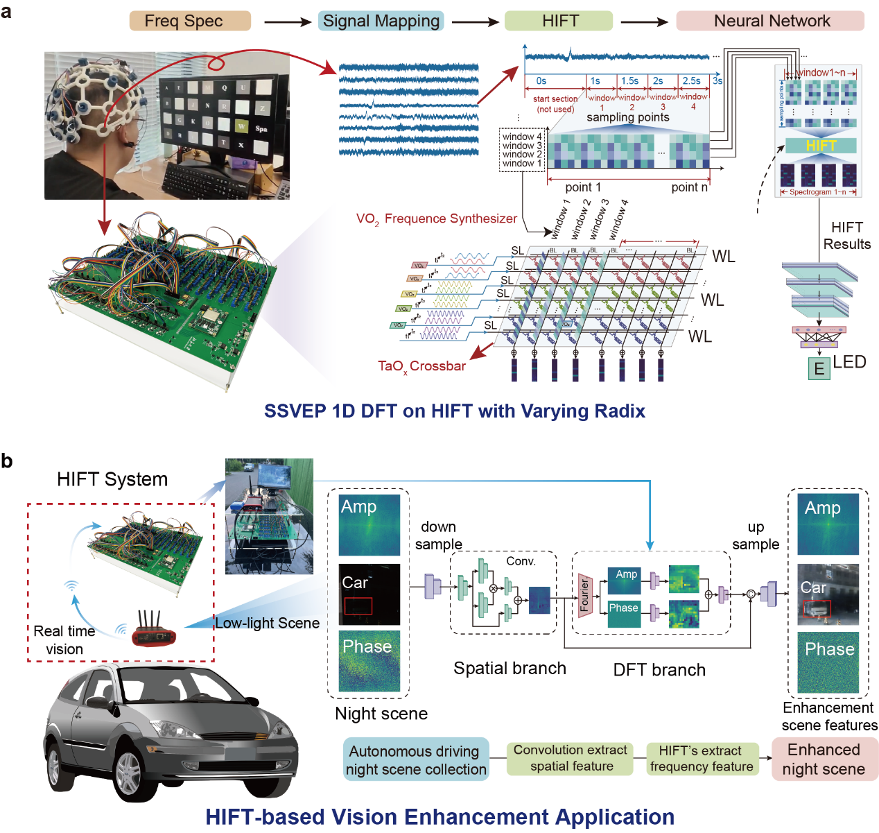 HIFT系统可支持任意基数(最高2048点)的以及非均匀离散傅里叶变换(NUDFT)。得益于忆阻器在存内计算中的高带宽与低延迟特性,该系统实现了O(N)级别的操作复杂度。本研究将HIFT系统应用于稳态视觉诱发电位(SSVEP)脑机接口,通过对EEG信号执行快速傅里叶变换以提取主频成分,实现了实时、低延迟的脑机打字,单次分类准确率可稳定达到99.2% 的。同时实验结果显示,HIFT的吞吐率可达504.3 GS/s,性能较现有FFT专用硬件提升 96.98倍。进一步地,本研究验证了HIFT系统在实际驾驶环境中对二维图像信息的增强能力,使其在二维傅里叶变换处理中能够保持频域重建的结构完备性与能量保持特性,有效支撑复杂视觉场景下的实时纹理解析与空间频率增强。