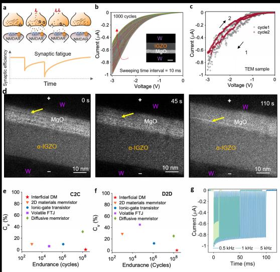 针对上述挑战,研究团队首先在材料与器件底层取得了突破。团队研发了一种结构为W/ɑ-IGZO/MgO/W 的新型界面型易失性忆阻器(Interfacial Dynamic Memristor, IDM)。与传统依赖导电细丝随机生长的忆阻器不同,该器件采用了与硅基后道工艺完全兼容的垂直叠层结构。利用**原位透射电子显微镜(in-situ TEM)和电子能量损失谱(EELS)**等先进表征手段,研究团队揭示了其独特的物理机制:氧离子在 ɑ--IGZO 与 MgO 界面层的反向扩散主导了Fatigue(疲劳)动力学,该过程与电场驱动的氧离子迁移形成竞争。这种界面型机制不仅赋予了器件优异的均一性和耐久性(稳定循环超过 2×108 次),更在离子动力学层面完美复现了生物突触的Fatigue(短时程抑制) 特性——即在高频脉冲刺激下,器件电导表现出累积抑制效应,而在低频下保持信号传输,具备天然的频率选择性。