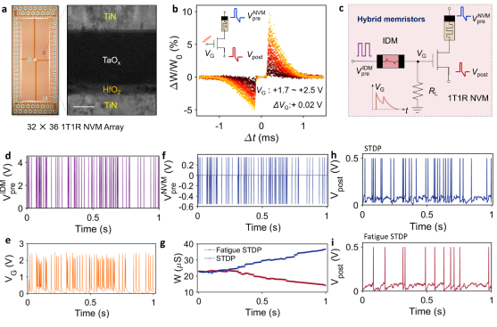 图7:忆阻器非线性混合动力学突触单元与Fatigue STDP学习规则特性。