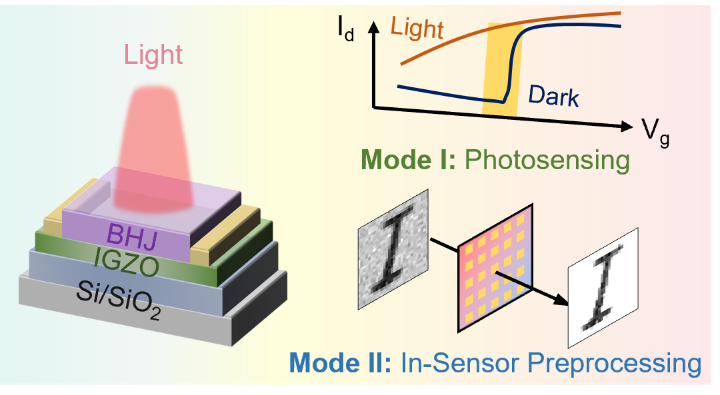 近日,信息工程学院周航课题组在纳米科学和纳米技术研究领域国际知名期刊ACS Nano(IF=16.1)上发表题为“Reconfigurable, Self-Adaptive Organic−Metal Oxide Hybrid Phototransistors for Highly Sensitive Photosensing and In-Sensor Image Preprocessing”的研究论文,该研究实现了一种可用于高灵敏度光电探测和传感器内图像预处理的可重构有机和金属氧化物异质结光电晶体管。