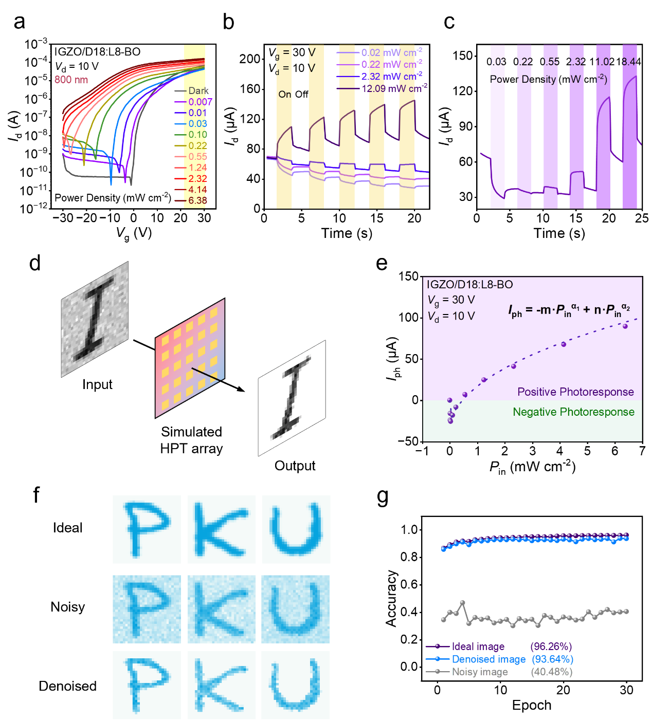 该工作提出并实现了一种可重构的IGZO/D18:L8-BO HPT,其可在不同栅压下实现高灵敏度光电探测和传感器内图像预处理的双模功能。栅压和光强的协同调控的异质结界面载流子俘获动力学使得IGZO/D18:L8-BO HPT具有双极性光门控效应,从而赋予HPT栅压可重构性和光强自适应性。负栅压下因光生空穴俘获诱导的正光门控效应使得HPT能实现高灵敏度的光电探测,其散粒噪声限制的比探测率D*可达1014 Jones;正栅压下光门控效应的极性可由光强调控,因此HPT的光响应极性对光强表现出自适应性,其在弱光下为负光响应,在强光下为正光响应。利用光强自适应的双向光响应,HPT可以实现传感器内的图像软阈值去噪预处理。本研究为有机和金属氧化物异质结界面的载流子输运动力学提供了物理见解,并为可重构和自适应光电子器件的开发提供了策略。